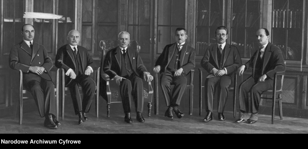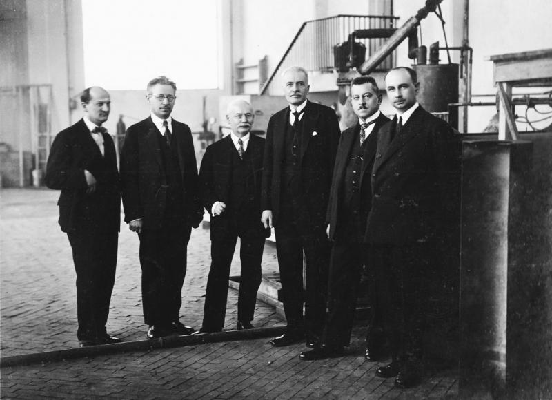 Od lewej dr L. Wasilewski, prof. W. Świętosławski, prof. J. Zawidzki, Prezydent I. Mościcki, dr Z. Martynowicz, prof. K. Kling