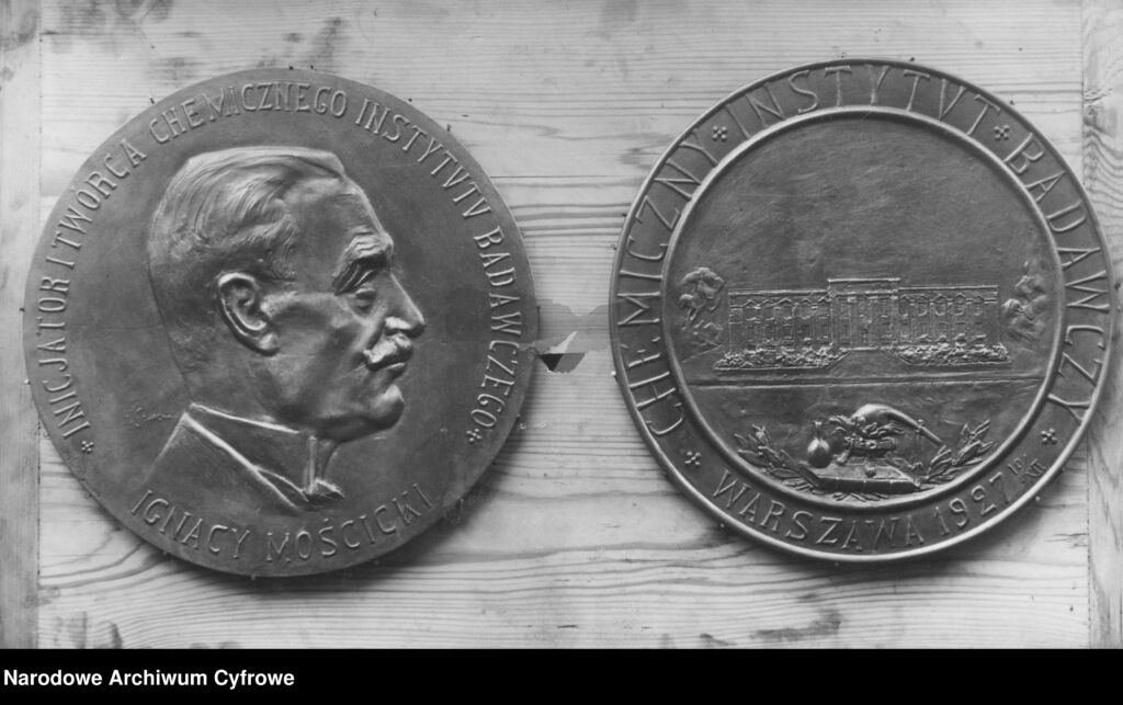 Awers i rewers medalu wybitego z okazji poświęcenia instytutu. Na awersie widoczny profil prezydenta RP Ignacego Mościckiego inicjatora i twórcy Chemicznego Instytutu Badawczego
