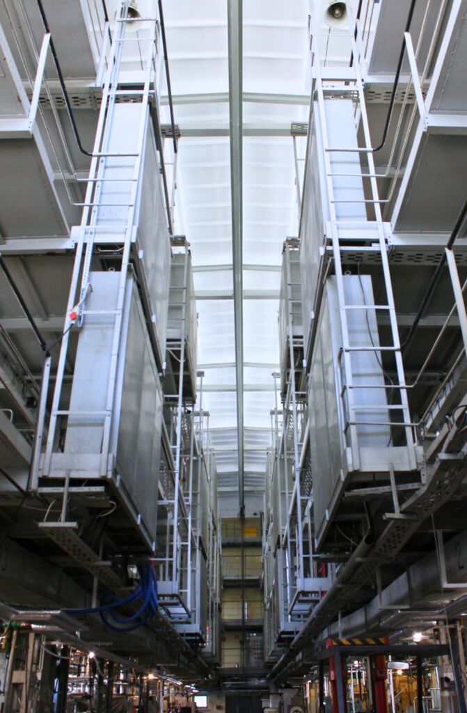 - Zarówno część niska, jak i wieżowa są jednokondygnacyjne, z antresolami zdystansowanymi od ścian zewnętrznych, na samonośnej konstrukcji stalowej, z podestami roboczymi stalowymi. Układ taki umożliwia dowolną adaptację przestrzeni, w tym montaż wysokich instalacji, przebiegających przez kilka poziomów podestów.