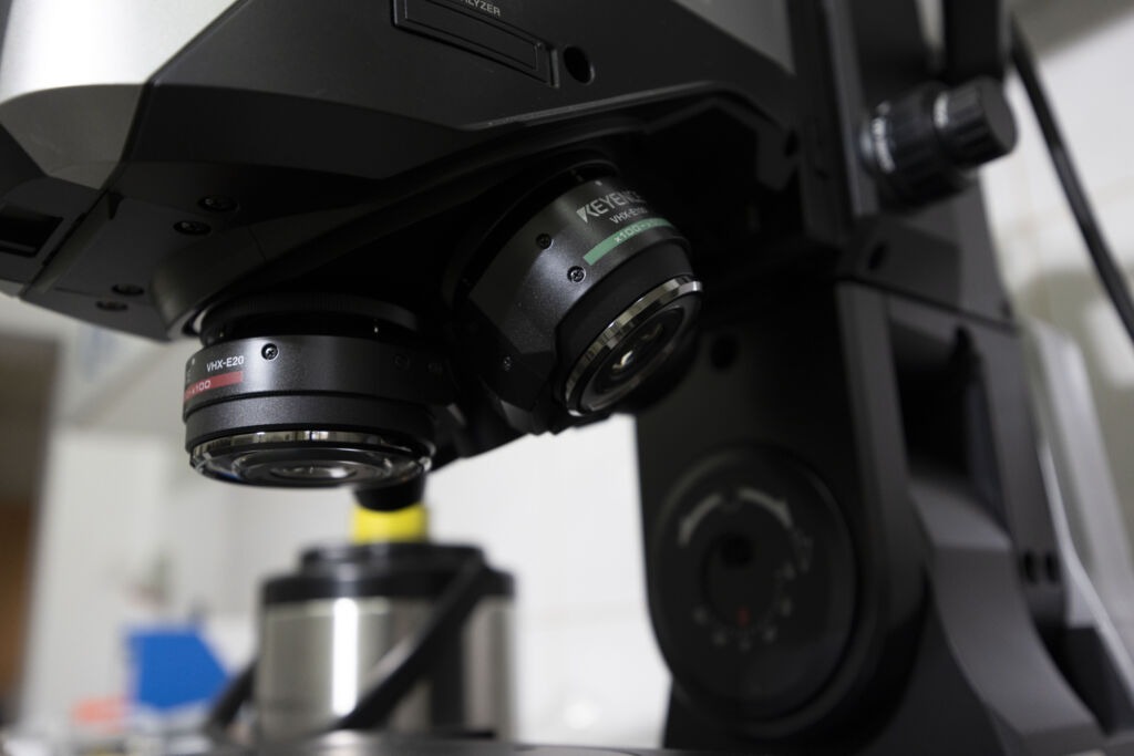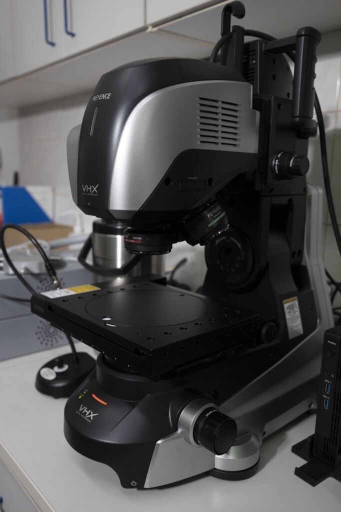 Zaawansowany mikroskop cyfrowy Keyence VHX-X1 o obiektywach od makro 5-50x aż do 2500-6000x do szczegółowych zastosowań analitycznych z funkcją zaawansowanego profilowania wraz z wyznaczaniem charakterystycznych parametrów chropowatości (Ra, Rz, Sa, Sz), wyposażony w pełni kompatybilne przystawki: grzewczo-chłodzącą (Linkam) działająca w zakresie (-196°C)-(+420°C) oraz adapter fluorescencyjny (Nightsea) – zakres wzbudzenia 360-540 nm;