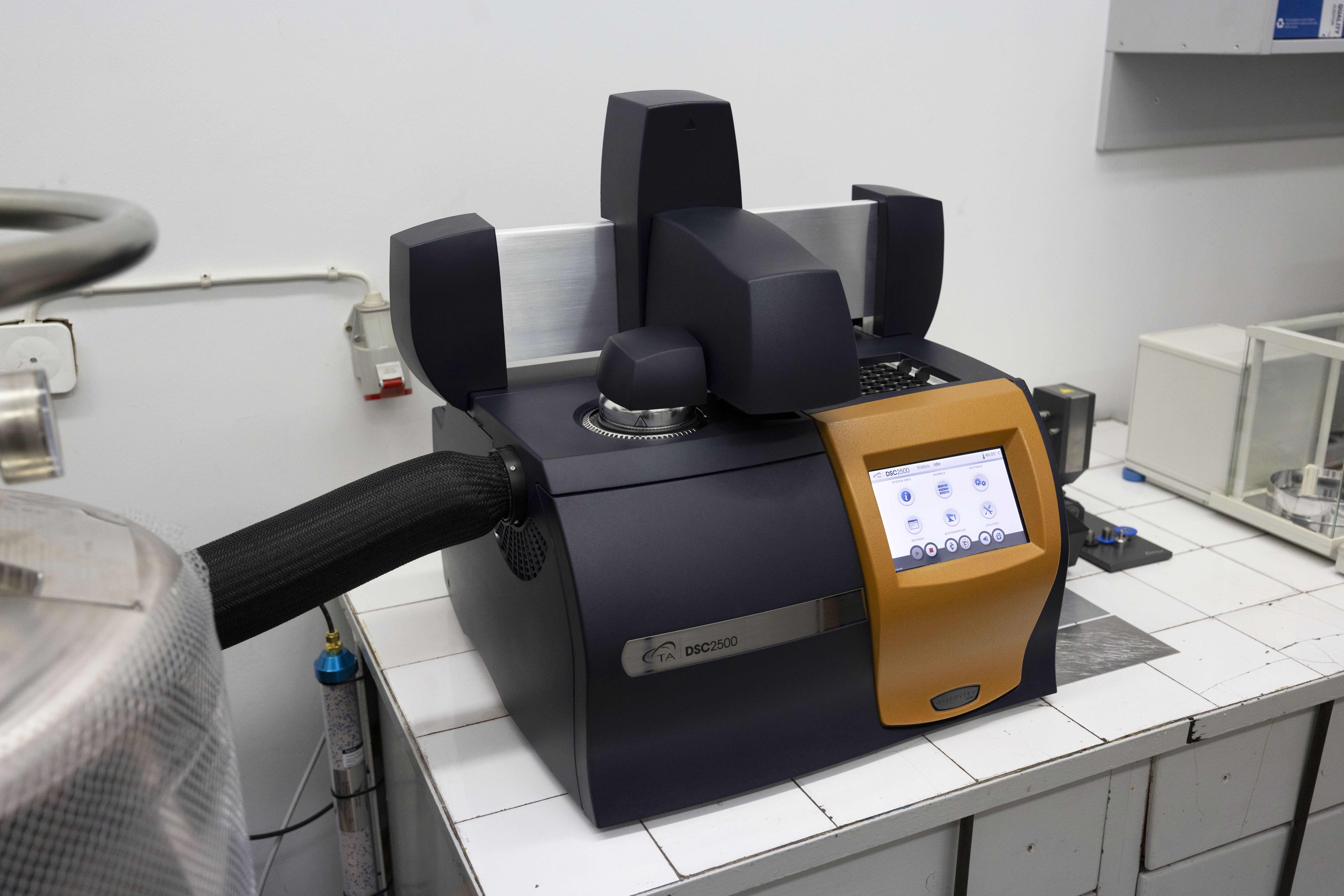 DSC (Differential Scanning Calorimeter) – Discovery DSC 2500 LN, TA Instruments – różnicowy kalorymetr skaningowy umożliwiający wg opatentowanej technologii Tzero™ bezpośredni pomiar przepływu ciepła i temperatur przemian fizykochemicznych materiałów w zakresie (-180) – (+300)°C:
